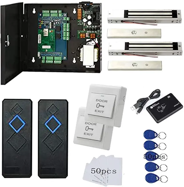 2 Door Access Control System with 600lbs Magnetic Lock Entry Access Control Panel 110V Power Supply Box RFID Reader Exit Button Enroll RFID USB Reader RFID Card Key Fob Phone APP Remotely Open Lock