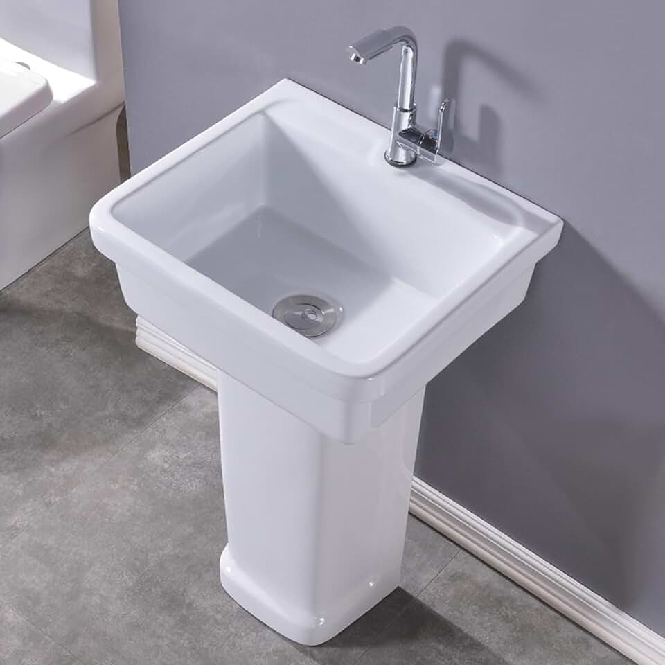 Ceramics Pedestal Sink White, One Piece Freestanding Pedestal Sink, with Hot and Cold Faucet, Utility Washing Hand Basin, Home Balcony Outdo