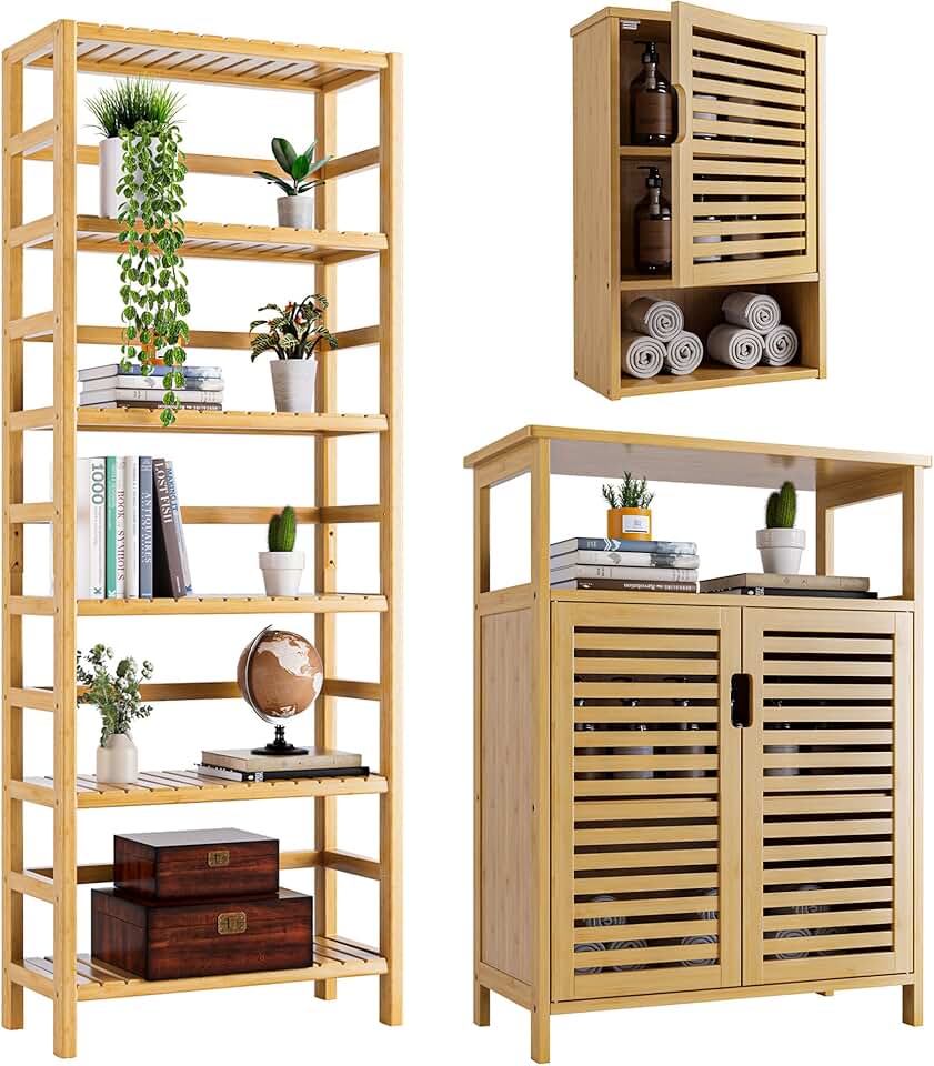 HITNET Bathroom Floor Cabinet Freestanding 6 Tier Bookshelf Wall Mounted Cabinet with Adjustable Shelf, Bamboo Storage Organizer for Living Room Kitchen, Natural