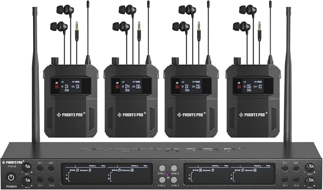 Wireless in Ear Monitor System, Quad-Channel Wireless IEM System, Metal IEM w/ 4 Bodypacks, 4x25 UHF Frequencies, Rack Mount, 164ft Range, Mono Deisgn, for Studio/Band (PTM-33)