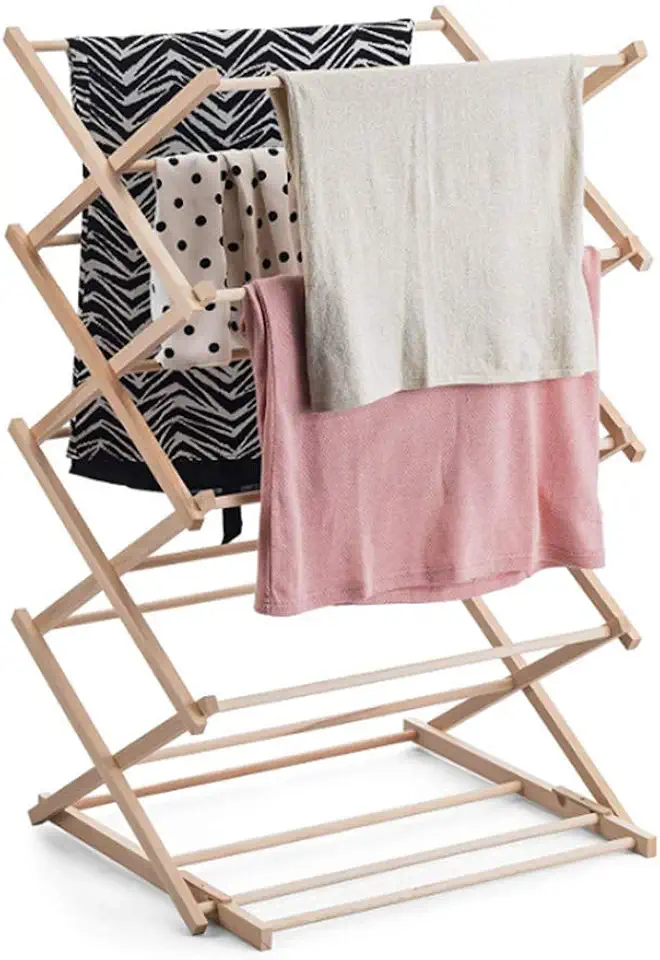 YJ Foldable Clothes Drying Laundry Rack, Floor Bedroom Hanger, 100% Natural Beech Wood, Suitable for Towels, Jeans, Shirts and Delicate Clothing