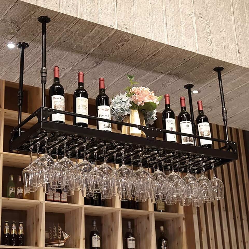 Ceiling Metal Wine Rack, Adjustable Height, Vintage Bar Floating Shelf, Hanging Glass Rack, Bottle Holder Upside Down Stemware Goblet, Display Stand for Bars Restaurants Kitchens (
