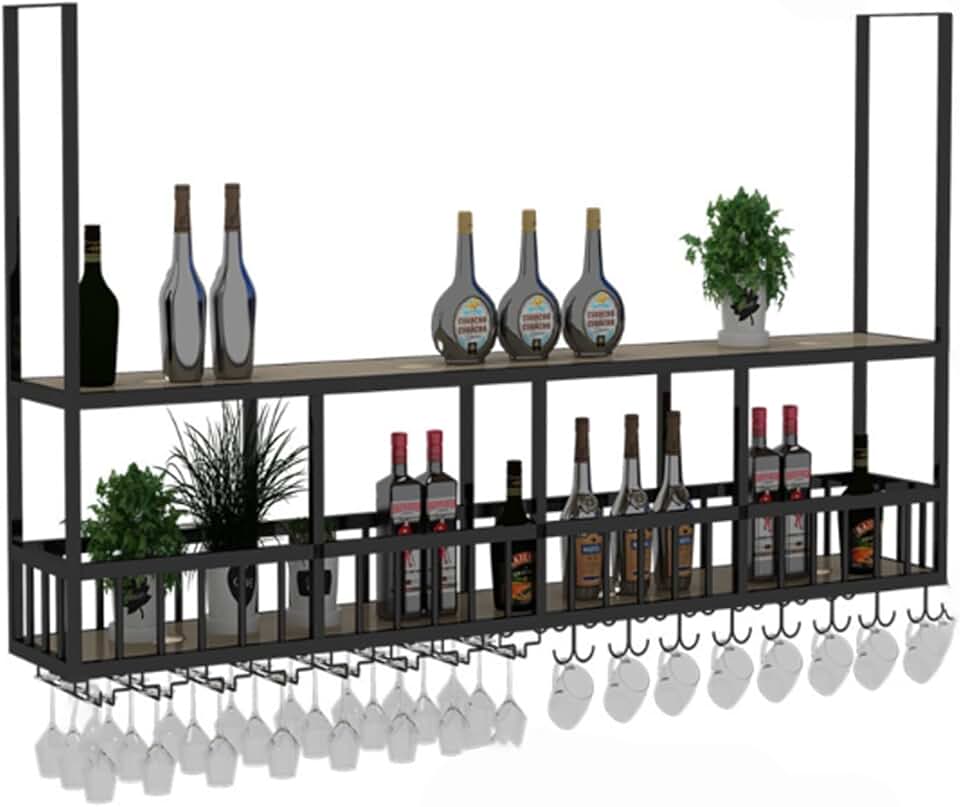 Iron Wine Shelf With Wine Glass Holder 2-Tiers Modern metal wine glass holder Hanging Display Storage wall mounted Goblet Display Storage with lights Wine Floating Storage Racks for Home Bars Kitchen(