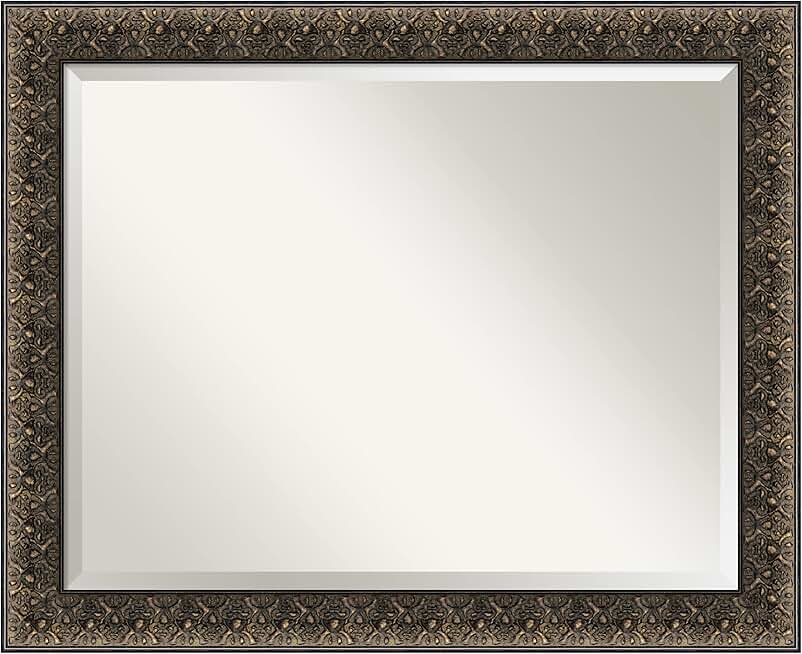 Amanti Art Wood Bathroom Mirror, Intaglio Embossed Black Wall Mirror for use as Bathroom Vanity Mirror Over Sink (26.5 x 32.5 in.) Beveled Mirror, Black Mirror, Traditional Mirror from WI, USA