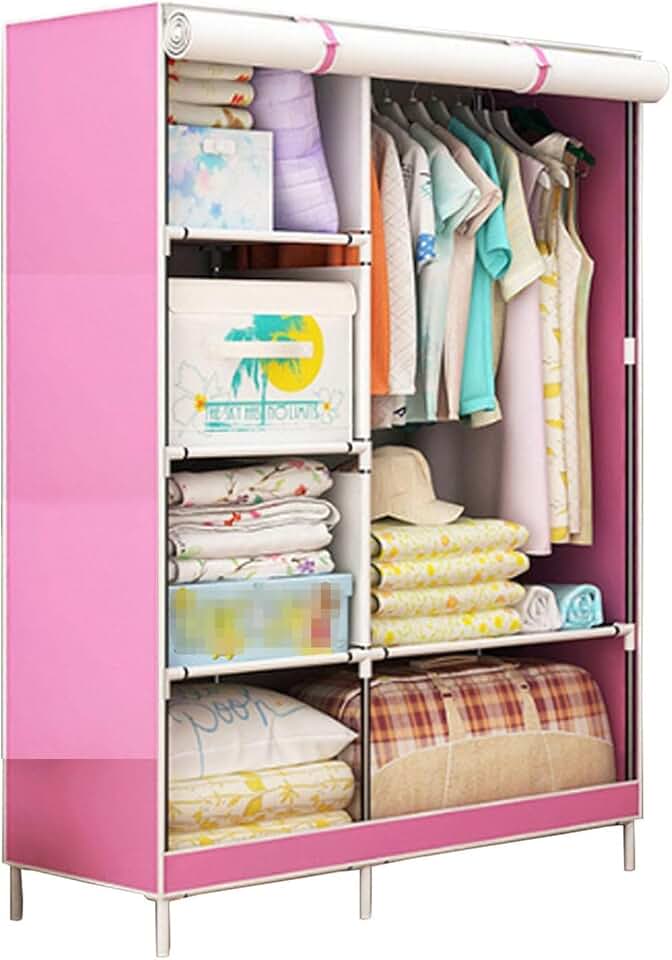 Wardrobe,Portable Fabric Canvas Wardrobe Shelves with Hanging Rail and Side Pockets,Clothes Closet Storage Organizer for Clothes,Bags,Pink-105x45x170cm