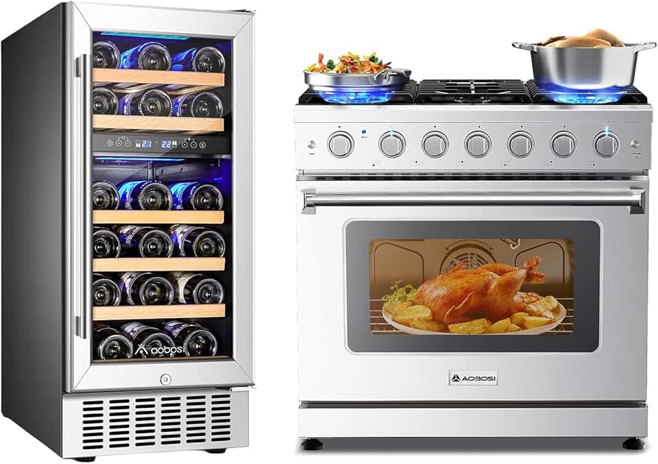 AAOBOSI 36 Inch Front Control Gas Range Oven with 6 Cooktop Burners, 6 Cu. Ft True Convection and Self Clean, 28 Bottles Wine Fridge, 15 Inch Dual Zone Wine Cooler with 6 Adjustable Shelves and Safety