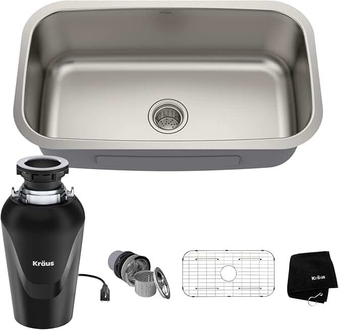 KRAUS Premier 31 ½-inch 16 Gauge Undermount Single Bowl Stainless Steel Kitchen Sink with WasteGuard™ Continuous Feed Garbage Disposal, KBU14-100-75MB