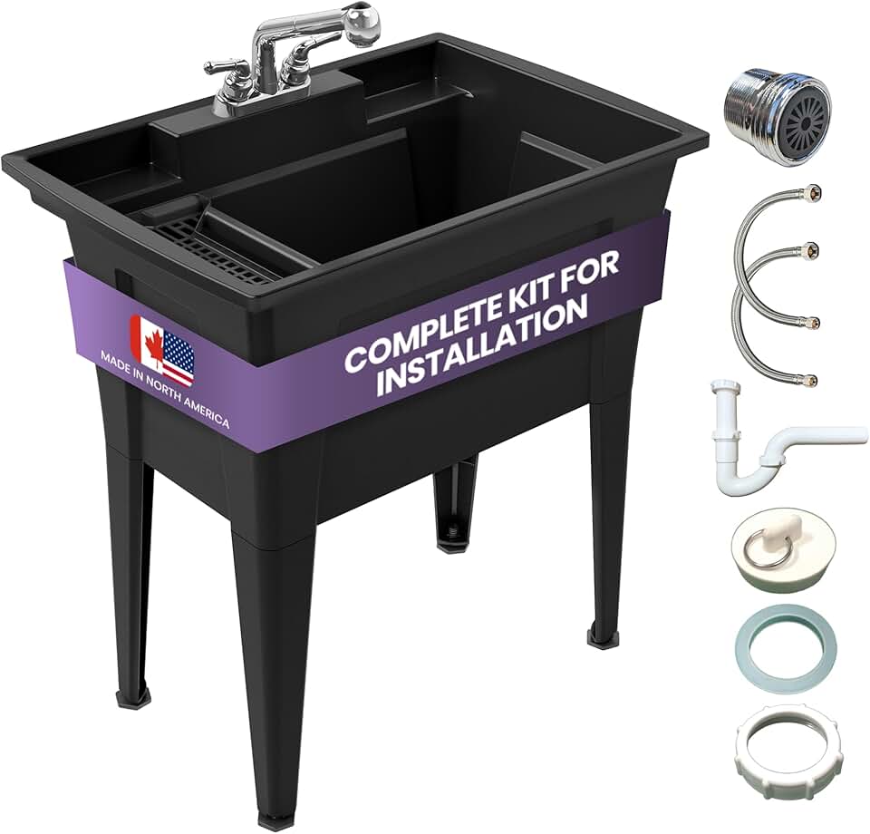 Utility Sink with Two-Handle Chrome plastic Faucet – 32” Utility Sinks for Laundry Room, Garage, Garden, Basement – Noah William Home Indoor and Outdoor Polypropylene Basement Wash Tub (Black)
