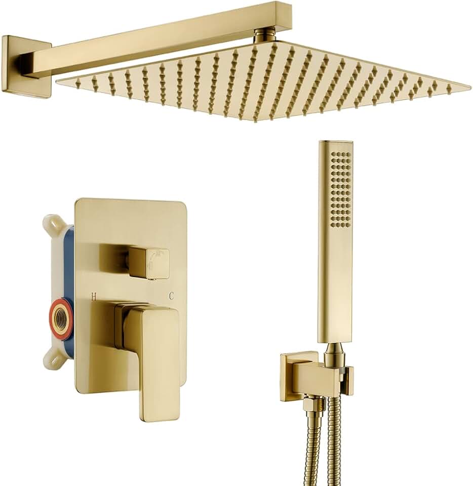Brushed Gold Shower System, Golden Shower Fixture with 12 Inch Rain Shower Head and Handheld Shower Head, Rainfall Shower Faucet with Brass Valve for Bathroom