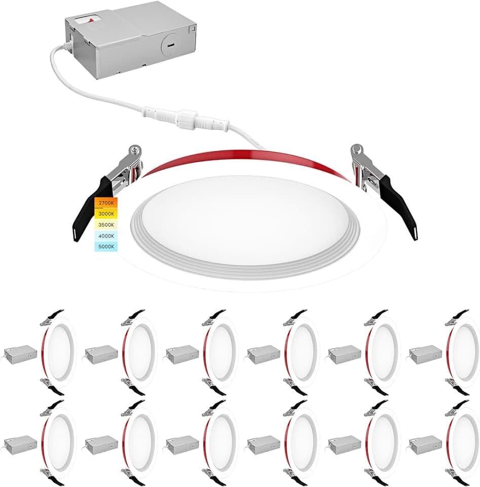 12-Pack 6 Inch Ultra Thin LED Fire Rated Recessed Lights, 5CCT 2700K/3000K/3500K/4000K/5000K, 2 Hour Fire Rating, 1050LM, Dimmable Wafer Lights, Baffle, IC & Wet Rated, UL, No Tenmat Needed