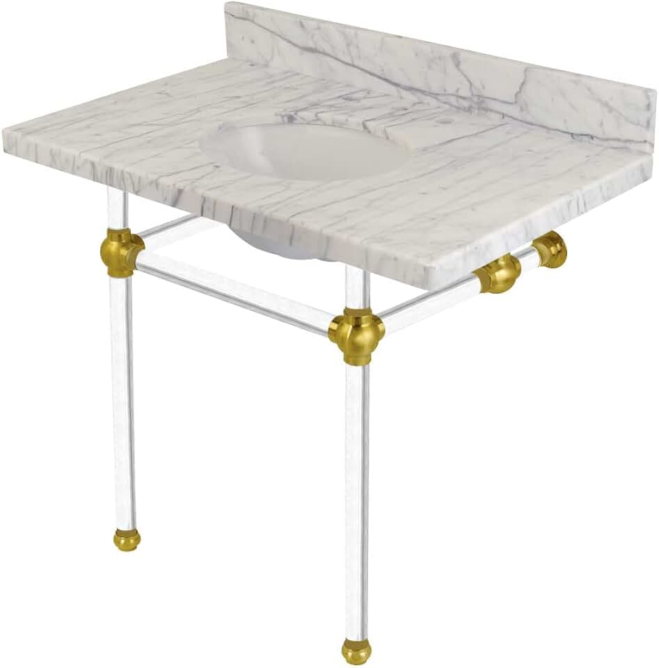 KVPB3630MA7 Templeton Carrara Marble Bathroom Console Vanity with Acrylic Pedestal, Carrara Marble/Brushed Brass