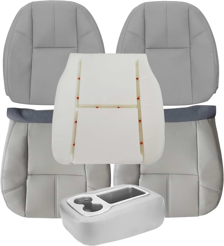 Driver & Passenger Side Bottom & Top Lean Back Leather Seat Cover & Center Console Cover & Driver Foam Cushion Light Gray Fit For Chevy Silverado Tahoe Suburban Avalanche GMC Yukon Sierra 2007-2014