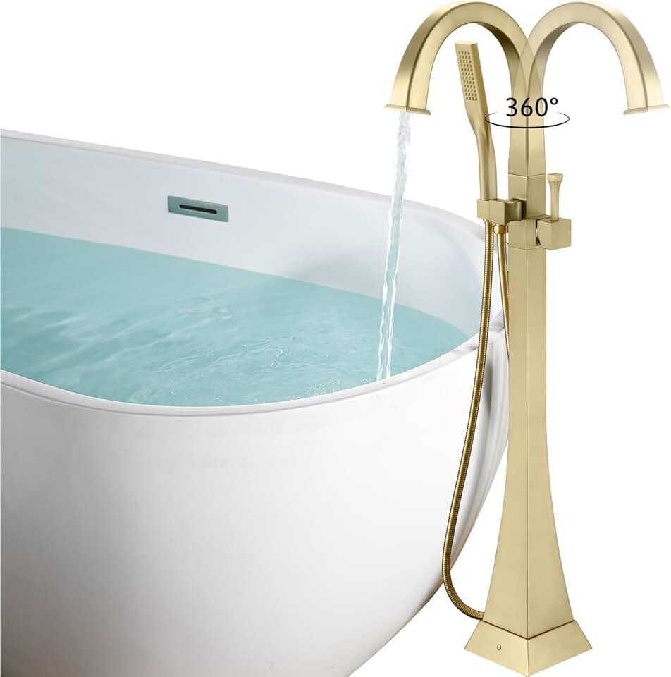 Freestanding Bathtub Faucet Brushed Gold Free Standing Tub Filler with 360° Swivel Spout and Handheld shower, Single Handle Brass Bathtub Faucet with Mixer Taps Floor Mount Bathroom Faucet