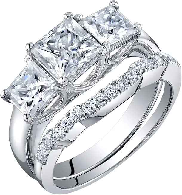 PEORA 2.75 Carats Moissanite 3-Stone Princess Cut Engagement Ring and Wedding Band Bridal Set for Women 925 Sterling Silver, D-E Color, VVS Clarity, Sizes 4 to 10