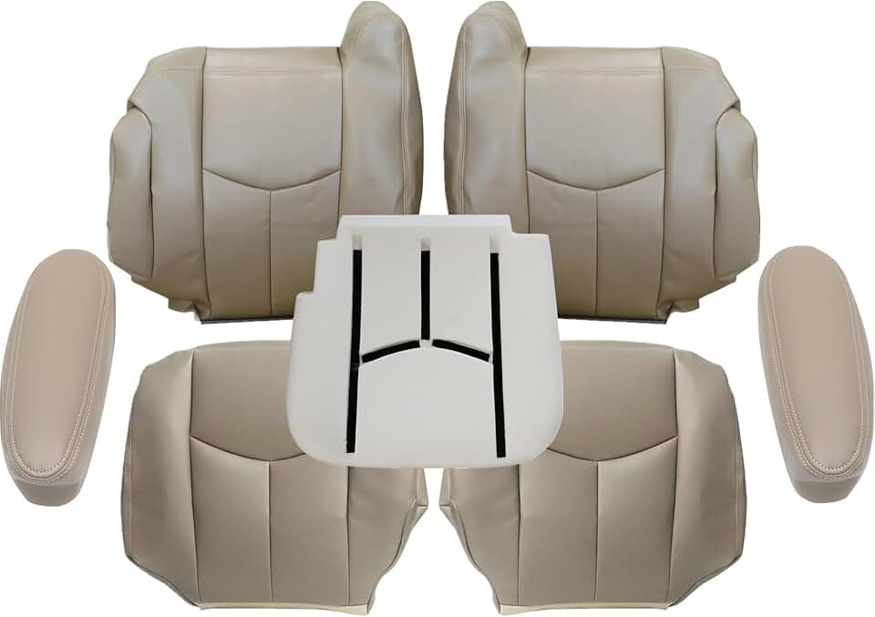 Driver and Passenger Bottom and Top Lean Back and Armrest Leather Seat Covers Tan #522 & Driver Foam Cushion Fit for Chevy Avalanche Silverado GMC Sierra 1500 2500 3500 HD 2003 2004 2005 2006