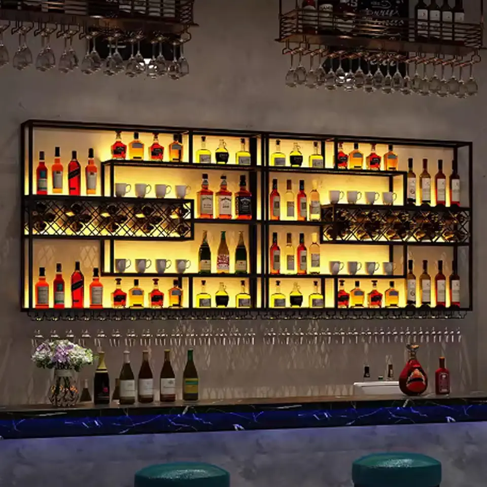 Large Wall Mounted metal wine rack with LED Lights Floating liquor bottle decorations display shelf Metal Hanging Goblet Rack Modern Large Capacity Industrial Iron Wine Shelf For Kitchen Dining Room