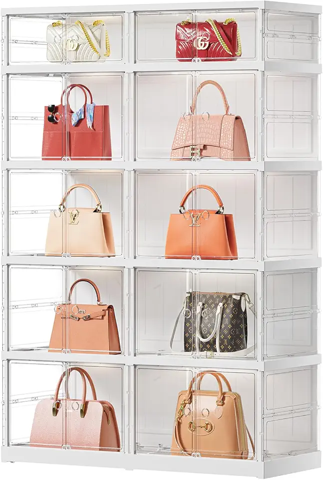 10 Cube Clear Handbag Storage Organizer for Closet,Large Plastic Handbag Display Case With Wheels,Foldable Purse Cabinet With Doors, 5Tier-10 Cubbies