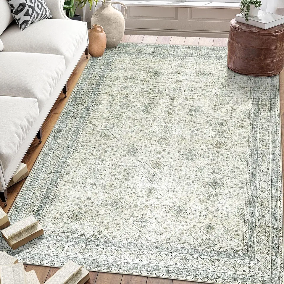 ReaLife Machine Washable Area Rug - Living Room Bedroom Bathroom Kitchen Entryway Office - Padded Low Pile Stain Resistant Premium - Boho Farmhouse Vintage - BEV - Green 7'6" x 9'6"