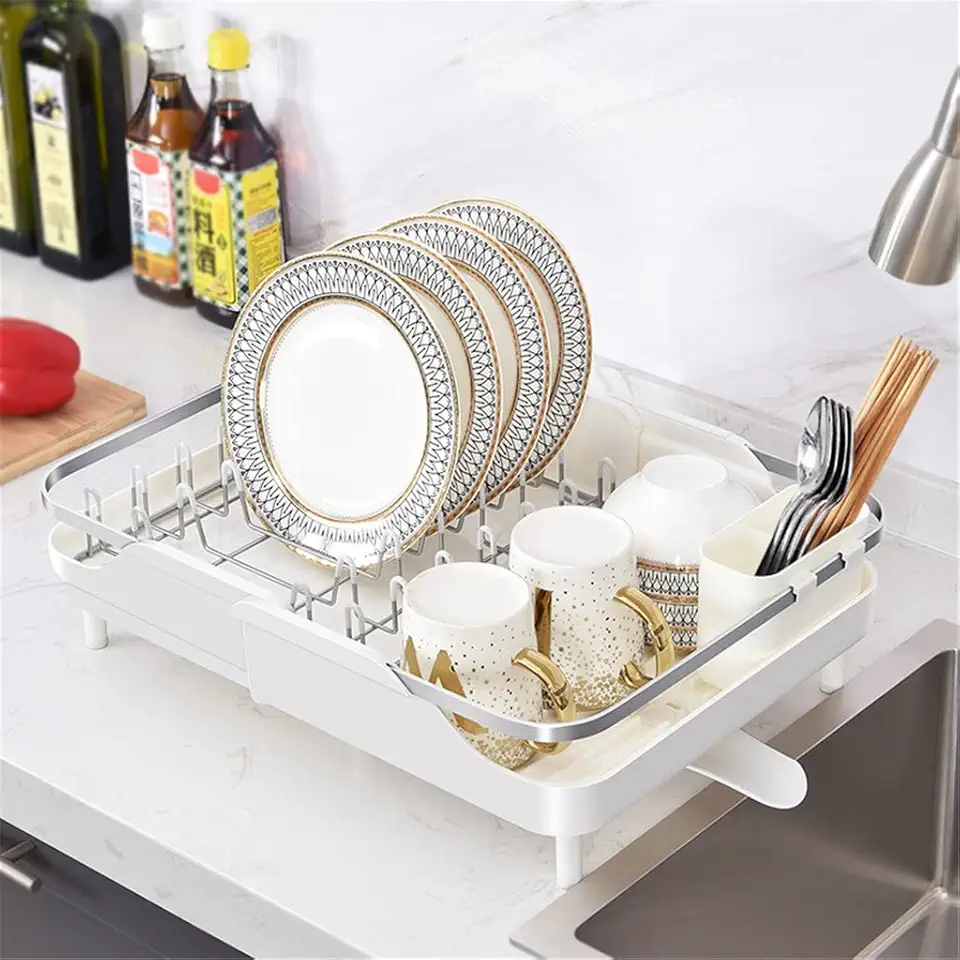 White Adjustable Stainless Steel Kitchen Dish Rack Tableware Plates Bowls Drying Organizer Drainer Cutlery