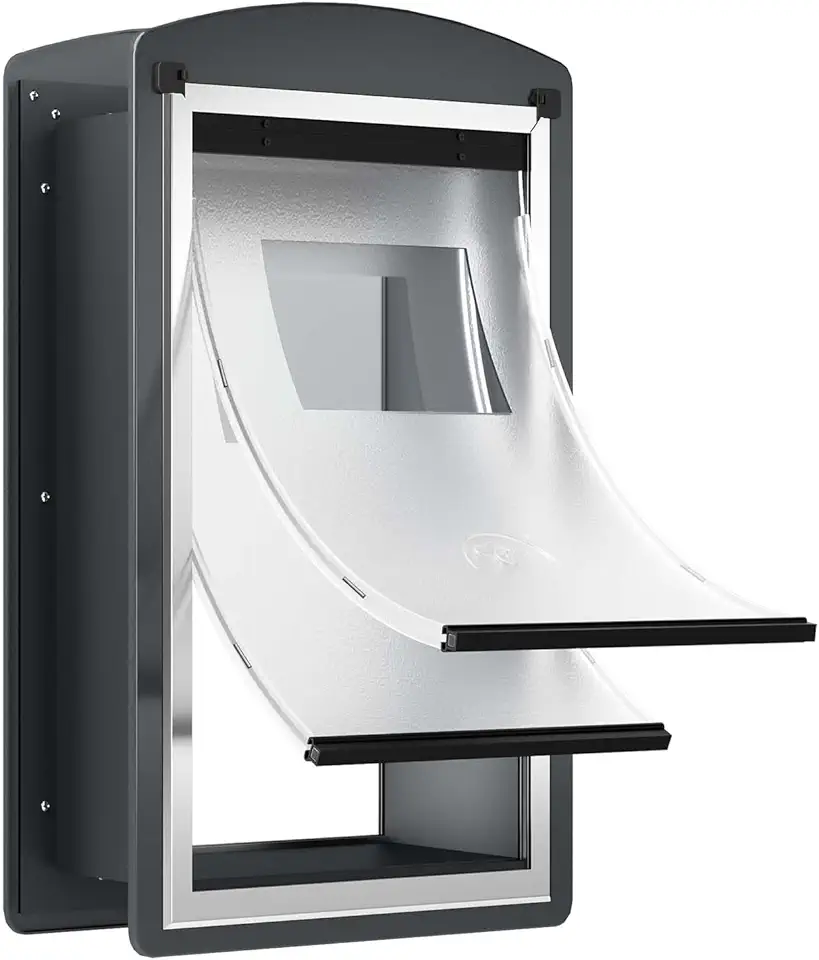 FreeStanding X-Large Dog Door for Exterior Walls, Large Dog Door with Steel Frame and Telescoping Tunnel, Magnetic Double Flap Design and Two Sliding Lock Panels, Easy to Install, Up to 200LBS, Gray