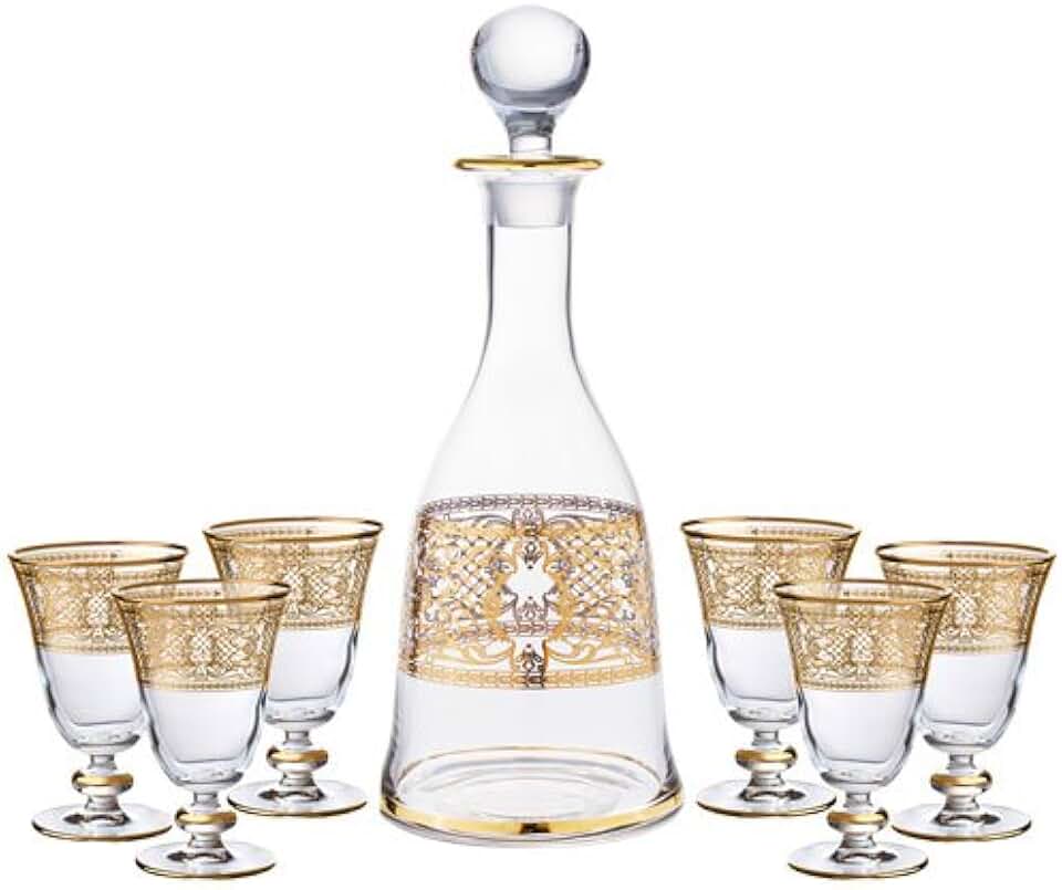 Decorative 8 Ounce Wine Glasses and Decanter Set - 7 Piece - 14 Karat Gold Accented.