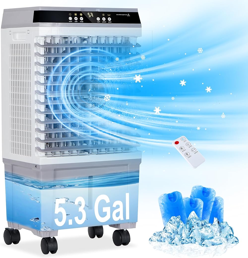 Evaporative Air Cooler, Swamp Cooler with 5.3 Gallon Water Tank, 4 Ice Box, Remote, 12H Timer, 110°Oscillation, Portable Air Cooler Cooling Fan with 3 Speeds for Bedroom Home Office
