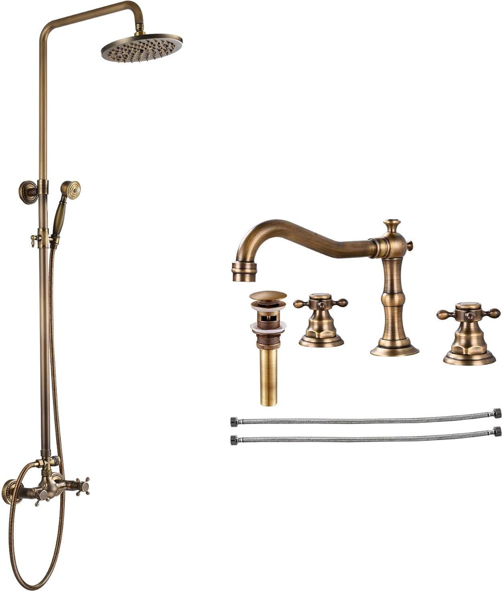 gotonovo Antique Brass 2 Functions Shower Fixture 8-inch Rain Shower Head Sets 2 Cross Knobs Wall Mounted With Matching Widespread Bathtub Faucet 2 Handle 3 Hole Deck Mount Bathroom Sink Faucet
