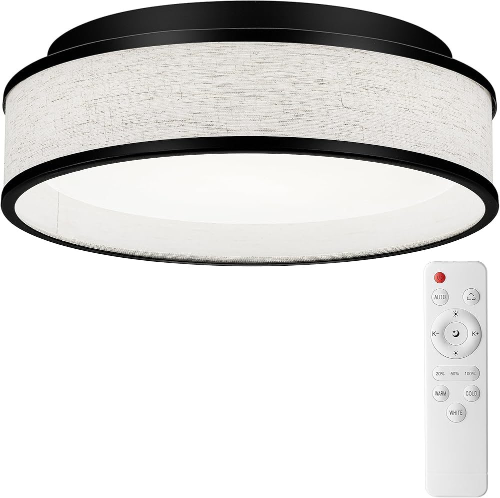 kudos Flush Mount Ceiling Light with Remote, Drum Light with Fabric Shade, 15-inch LED Ceiling Light Fixture, 32W 1800lm Light Fixtures for Living Room, Kitchen, Bedroom, Hallway, KDCL13-BK-L-RM