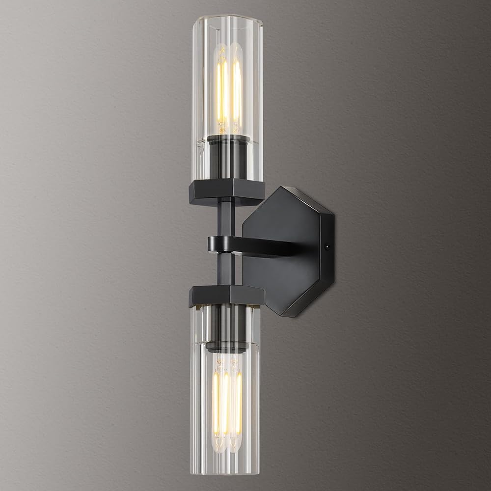 Black Wall Sconces, 18" Hexagonal Crystal Bathroom Sconces, Dimmable Sconces Wall Lighting, 2-Lights Vanity Lights Fixtures Over Mirror Wall Lights for Living Room, Bedroom 1PC