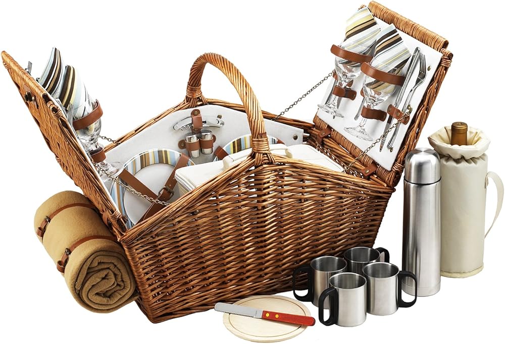 Picnic at Ascot Huntsman English-Style Willow Picnic Basket with Service for 4, Coffee Set and Blanket- Designed, Assembled & Quality Approved in the USA