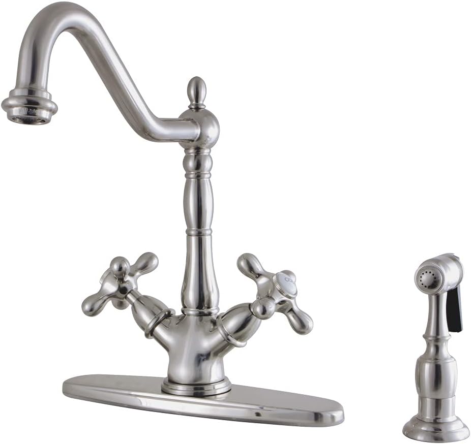 Kingston Brass KS1238AXBS Heritage Deck Mount Kitchen Faucet with AX Handle and Brass Sprayer, 8-1/2", Brushed Nickel