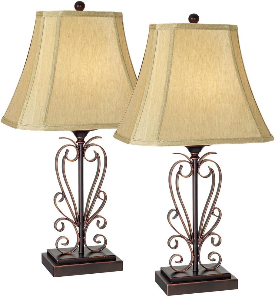 Franklin Iron Works Traditional Table Lamps 26.5" High Set of 2 Open Iron Scrollwork Bronze Copper Metal Faux Silk Rectangle Shades for Living Room Bedroom House Bedside Nightstand Home Office