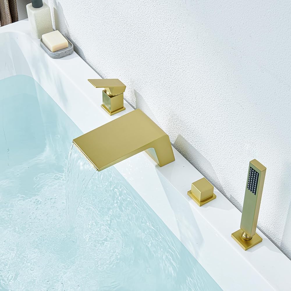 Deck Mount Roman Tub Faucet with Handheld Sprayer, Brushed Gold Waterfall Tub Filler High Flow Hand Shower Faucet, Widespread 4-Holes Tub Shower Faucet Set for Bathroom, 02767BG