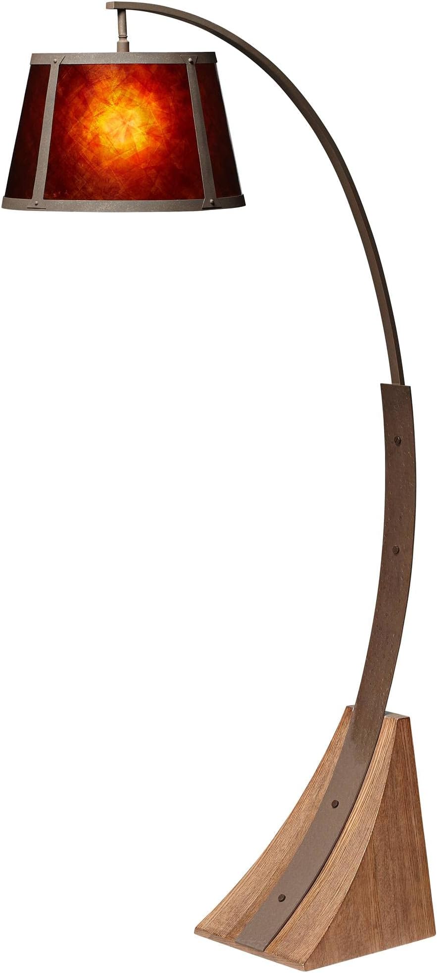 Franklin Iron Works Oak River Mission Style Arc Floor Lamp with USB Charging Port 66 1/2" Tall Dark Rust Natural Wood Base Amber Mica Drum Shade Decor for Living Room Reading House Bedroom Home