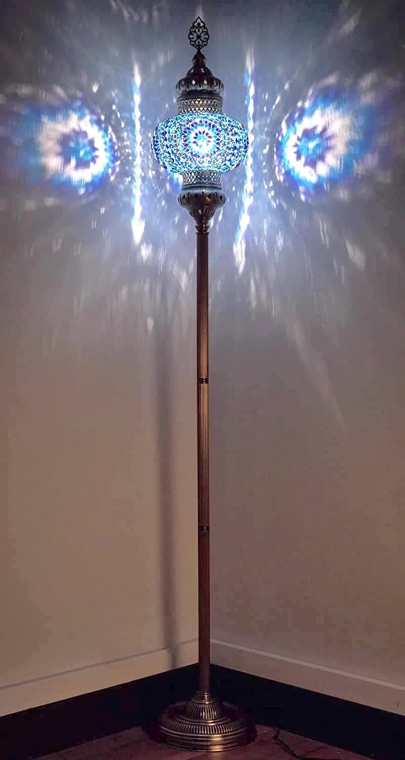 DEMMEX Biggest Size 10" Globe Turkish Moroccan Mosaic Floor Lamp, Bohemian Colorful Mosaic Glass Exotic Oriental Floor Lamp, Antique Brass Color Metal Body, 5.5ft Height, Handmade (Blue)