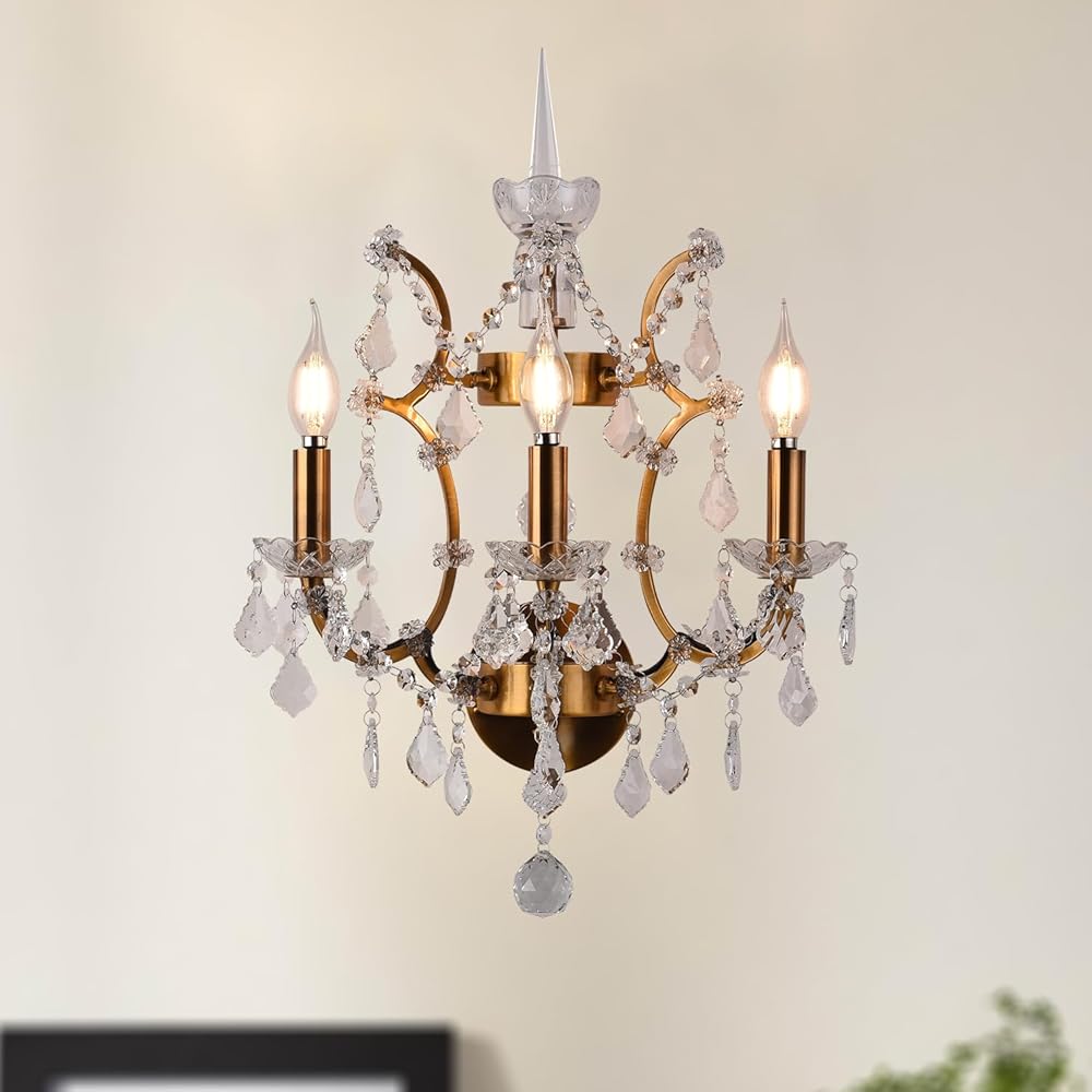 Modern Crystal Wall Sconces, Luxury Wall Lights Fixtures, Brass Candle Wall Lamp for Bedroom Living Room Staircase Entryway Dining Room Bathroom (3-Lights)