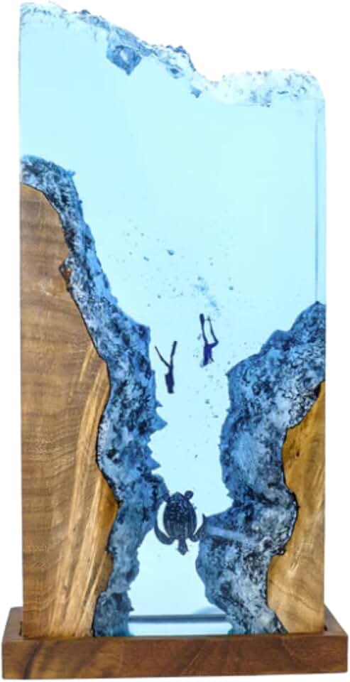 Sea Turtle and Divers Explore Undersea Epoxy Resin Lamp, Diving Epoxy Resin Wood Lamp, Scuba Gift, Ocean Theme Diorama, Scuba Lamp, Ocean Lamp, Divers Night Light Large (18x9 inch)