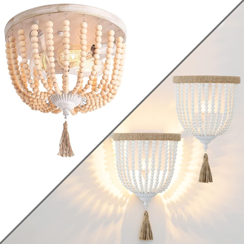 Farmhouse Wood Beaded Flush Mount Ceiling Light & 2PCS Boho Wood Beaded Wall Light