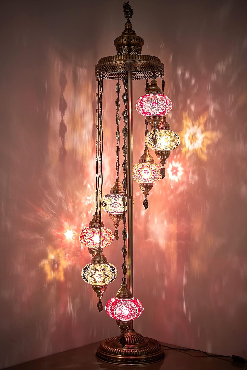 DEMMEX - 7 Big Globes Turkish Moroccan Mosaic Floor Lamp Light, Bohemian Boho Tiffany Mosaic Floor Lamp with North American Plug & Socket, 5' (Reds-Browns)