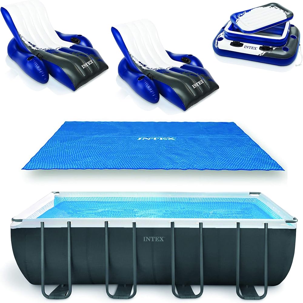 INTEX 18'x52 Framed Swimming Pool with Solar Pool Cover, Inflatable 72 Can Beverage Cooler Float, and Inflatable Floating Recliner Chairs (2 Pack)