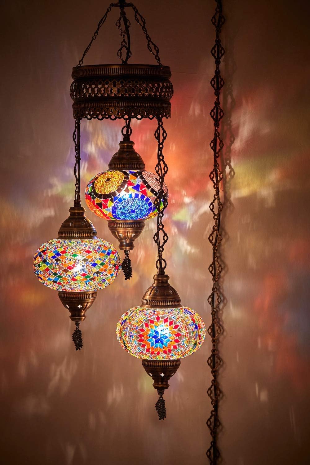 DEMMEX Turkish Moroccan Mosaic Swag Plug in Chandelier Ceiling Hanging Lamp Pendant Light Fixture Lighting, 15ft Cord Chain and Plug, 3 Big Globes (Multicolor (Plug in))