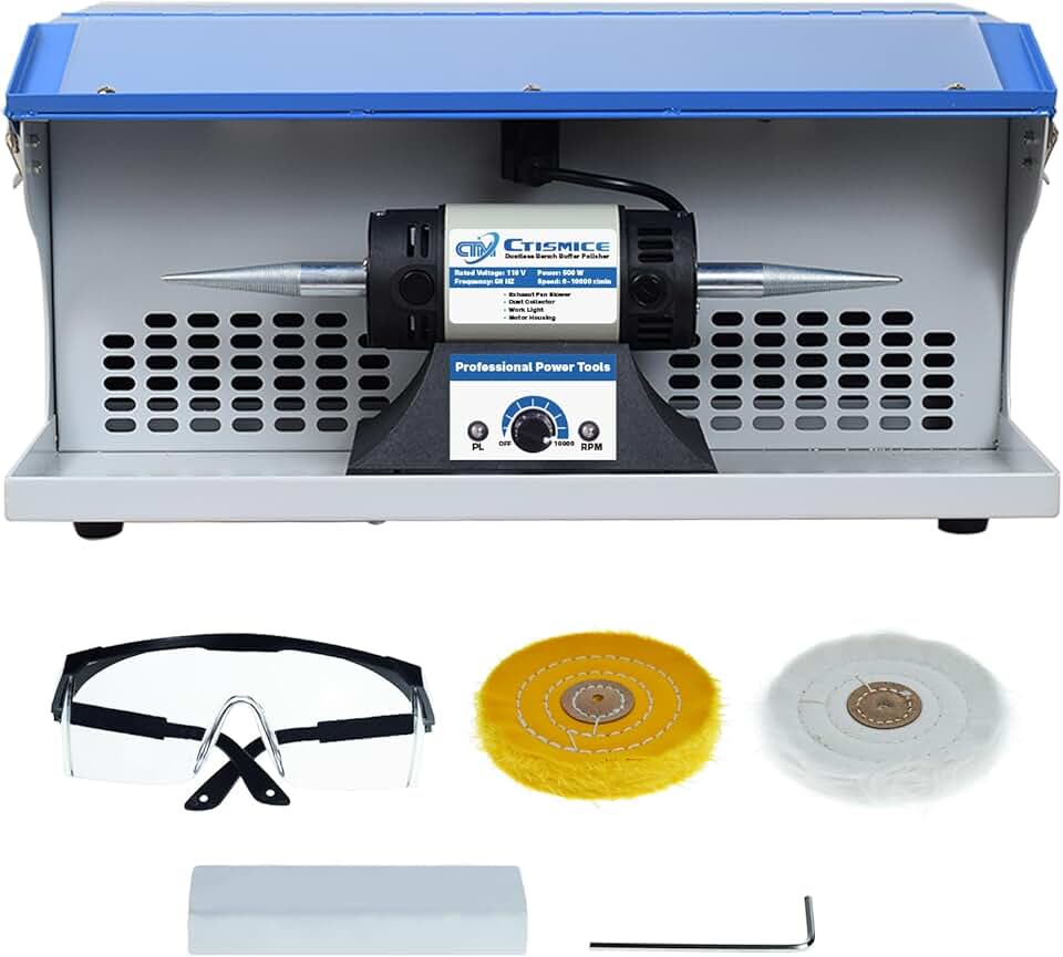 Jewelry Bench Polisher, Adjustable Variable Speed Polishing Buffing Machine, 500W Buffer Grinder with Exhaust Fan Blower, Dust Collector, Work Light and Motor Housing for Jewelry, Metal, Wood