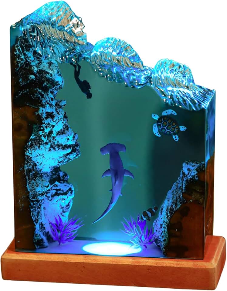 Hammerhead Sharks Lamp, Turtle Ocean Night Light, Epoxy Resin Ocean Lamp, Jellyfish and Diver Lamp, Free Diving, Unique Gift Home Decor, Sharks and Divers Night Light (12x6 inch)