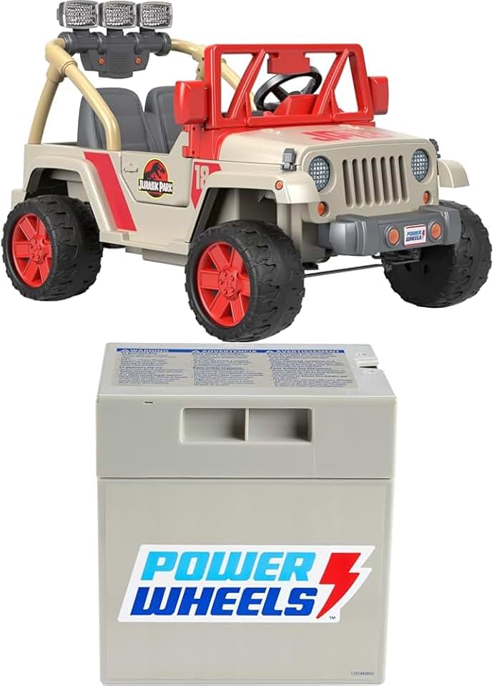 Bundle of Power Wheels Jurassic Park Jeep Wrangler Ride-On with Dinosaur Sounds & Lights for Preschool Kids Ages 3+ Years + Power Wheels Replacement Battery 12-Volt 12-Ah Rechargeable