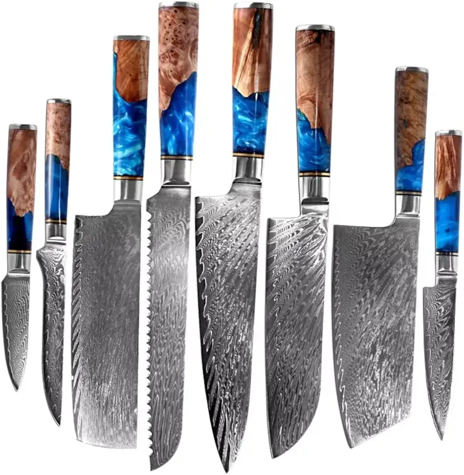 Tidal Collection kitchen knife set with Burl Wood Resin Handles (Blue Resin Handle). This 8-pc damascus chef knife set, are ideal kitchen knives set for the kitchen.