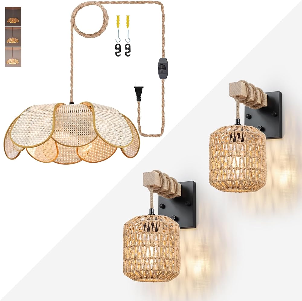 Rattan Hanging Light with Plug in Cord & Rattan Boho Wall Sconces Set of Two