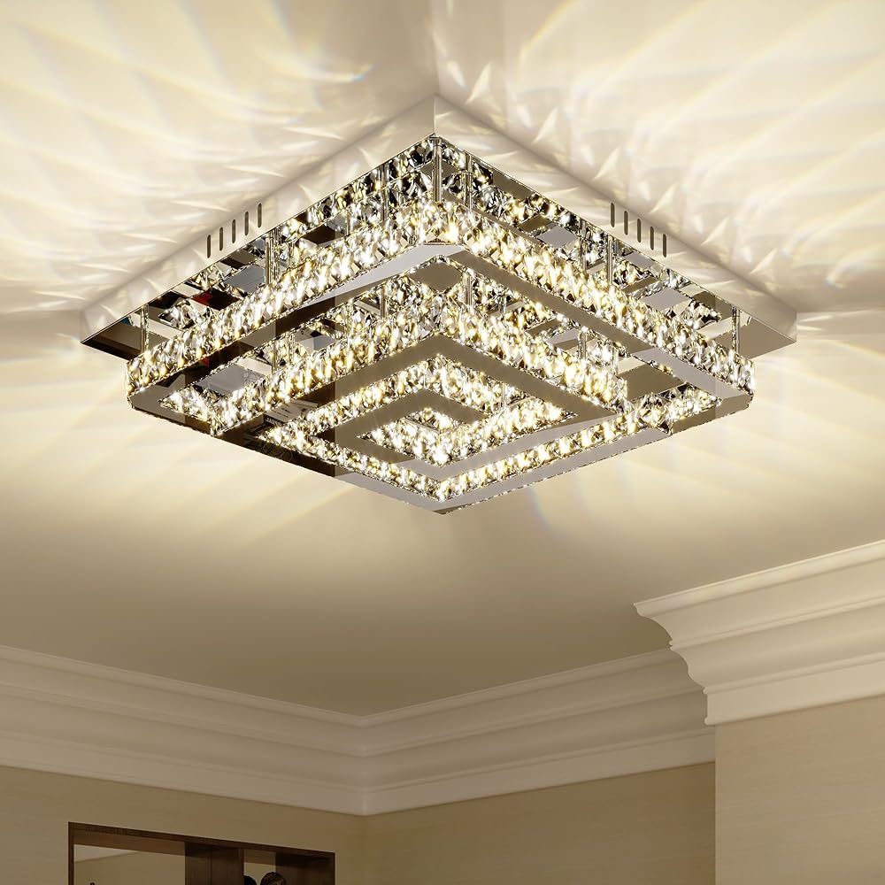 24" Large Elegant Crystal Chandelier, Modern Led 3 Color Dimmable Ceiling Light 2 Layers Square Flush Mount Ceiling Lamp for Bedrooms Dining Rooms Living Room Kitchen Staircase Hallway(Dimmable)