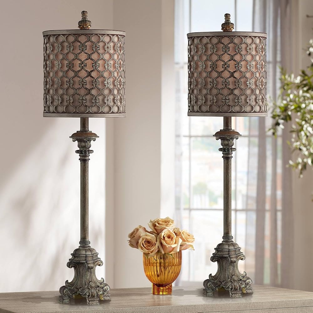 Regency Hill Vichelis 34" Tall Skinny Candlestick Buffet Traditional Vintage End Table Lamps Set of 2 Beige Metal Fabric Shade Living Room Bedroom Bedside Nightstand House Office Home Reading