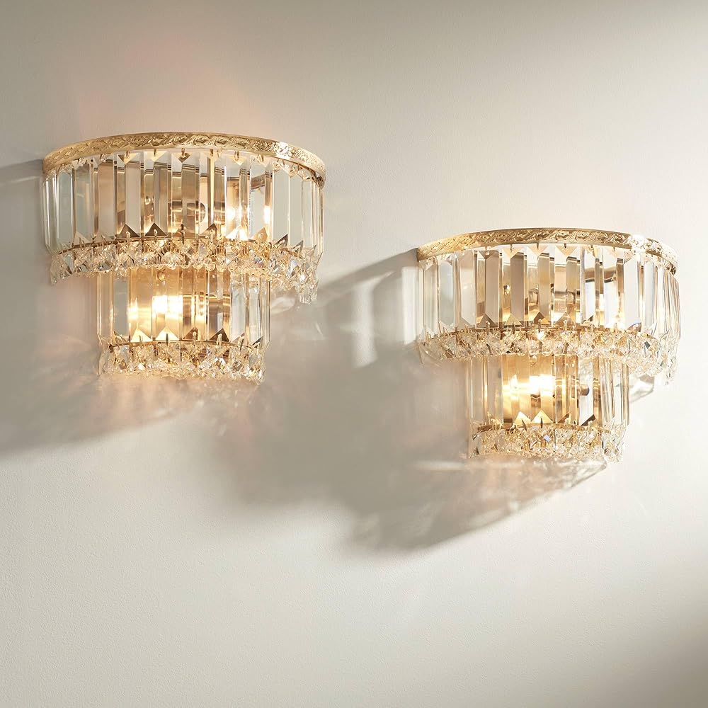 Magnificence Modern Wall Light Sconces Set of 2 Gold Hardwired 10" Fixture Demilune Clear Crystal for Bedroom Bathroom Bedside Vanity Reading Living Room Hallway House Home