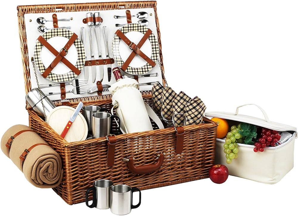 Picnic at Ascot Dorset English-Style Willow Picnic Basket with Service for 4, Coffee Set and Blanket- Designed, Assembled & Quality Approved in the USA